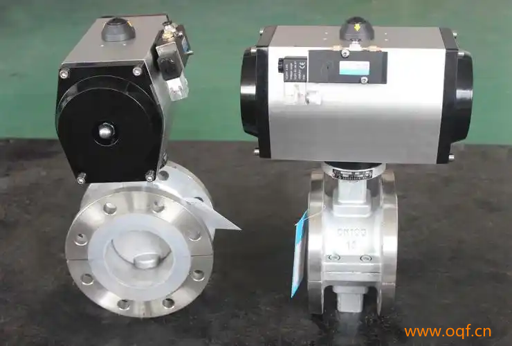 当气动执行器与电路和系统气源接通后,空气通过管道A或B管进入A缸(B缸)推动活塞向一端运动,从而带动旋转轴和球芯转动90°。